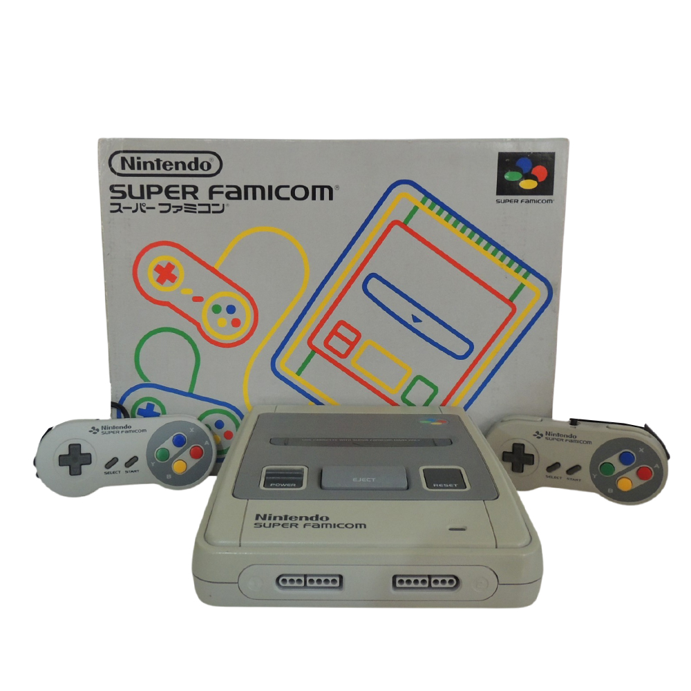 O Super Famicom é a versão japonesa do lendário Super Nintendo Entertainment System, lançado pela Nintendo em 1990 no Japão. Representando a evolução direta do Famicom, o console marcou a transição definitiva da era 8-bits para os 16-bits, oferecendo gráficos muito mais detalhados, trilhas sonoras complexas e efeitos visuais inéditos para a época, como transparências, rotações e o famoso Mode 7. Seu design compacto e colorido se tornou icônico, sendo até hoje considerado por muitos jogadores como um dos consoles mais bonitos já produzidos.